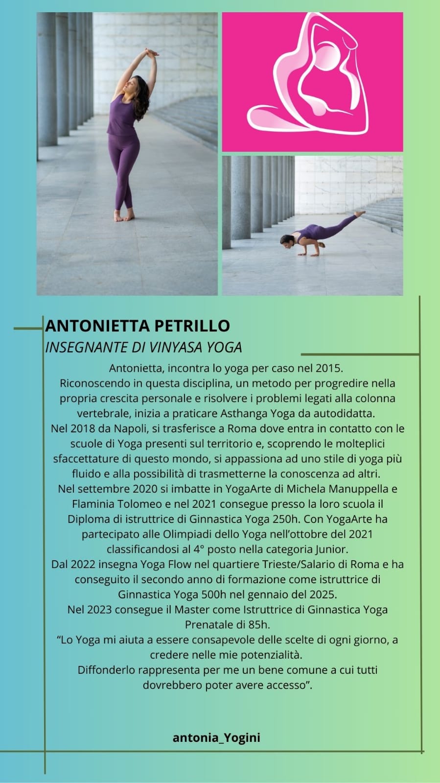 “lo Yoga mi aiuta a essere consapevole delle scelte di ogni giorno, a credere nelle mie potenzialità. Diffonderlo rappresenta per me un bene comune a cui tutti dovrebbero poter avere accesso”.
